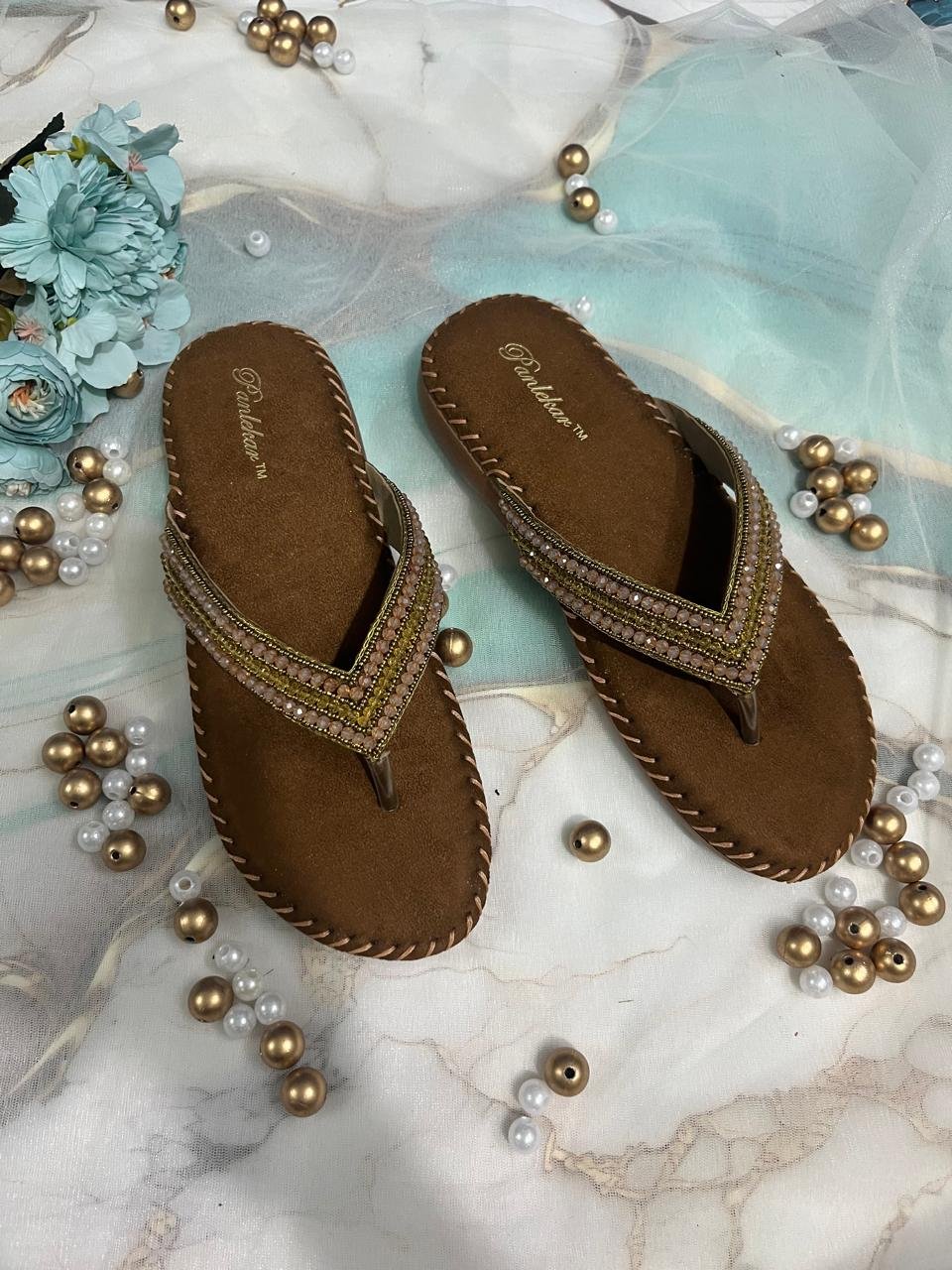 Elevate your ethnic and festive look with these elegant brown slip-on sandals from Panlekar™. Designed with a classic V-shaped thong strap, these sandals are adorned with shimmering black and silver rhinestones, offering a perfect blend of simplicity and sparkle. The black velvet-like finish on the upper and footbed adds a touch of luxury, while the cushioned sole ensures comfort throughout the day.