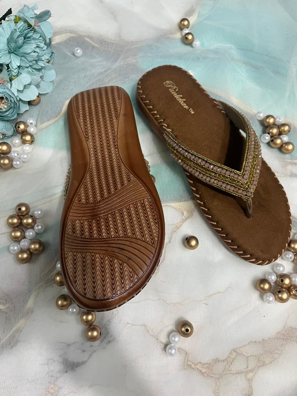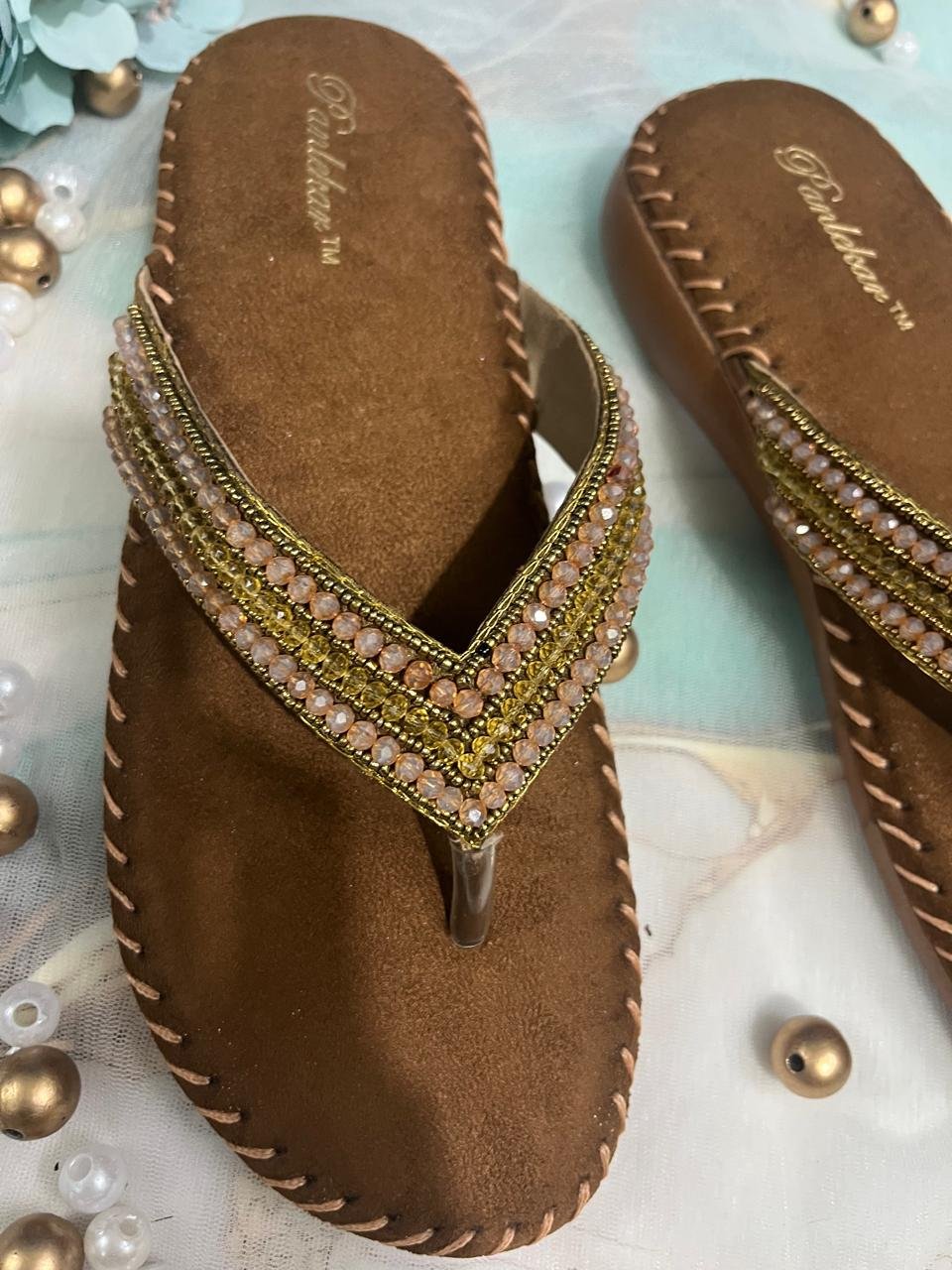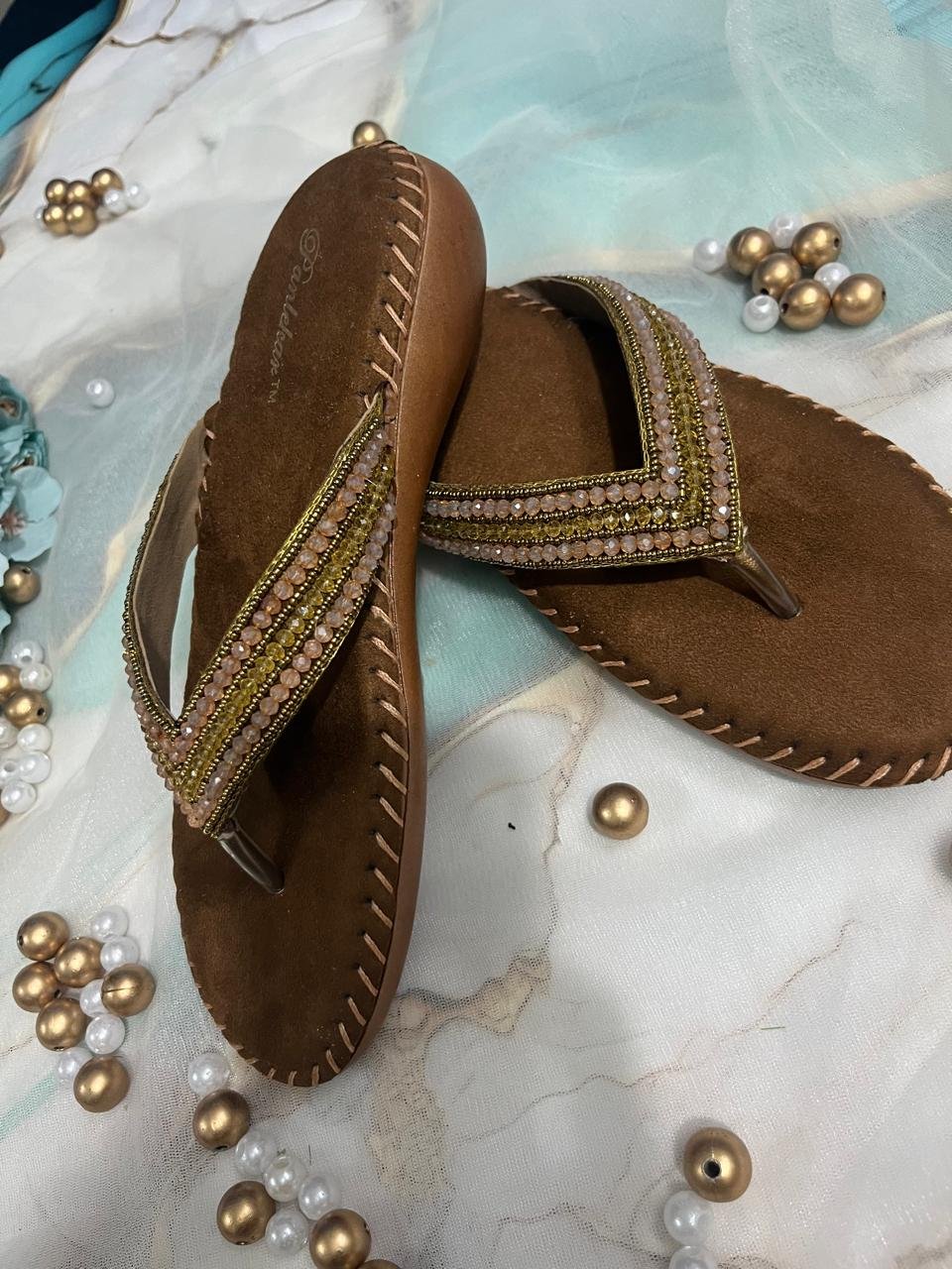 The footwear features a hand-stitched edge detail on the sole, enhancing durability and giving it a handcrafted look. Ideal for pairing with both traditional outfits and Indo-western wear, these sandals are a must-have for festive occasions, casual gatherings, or evening events.