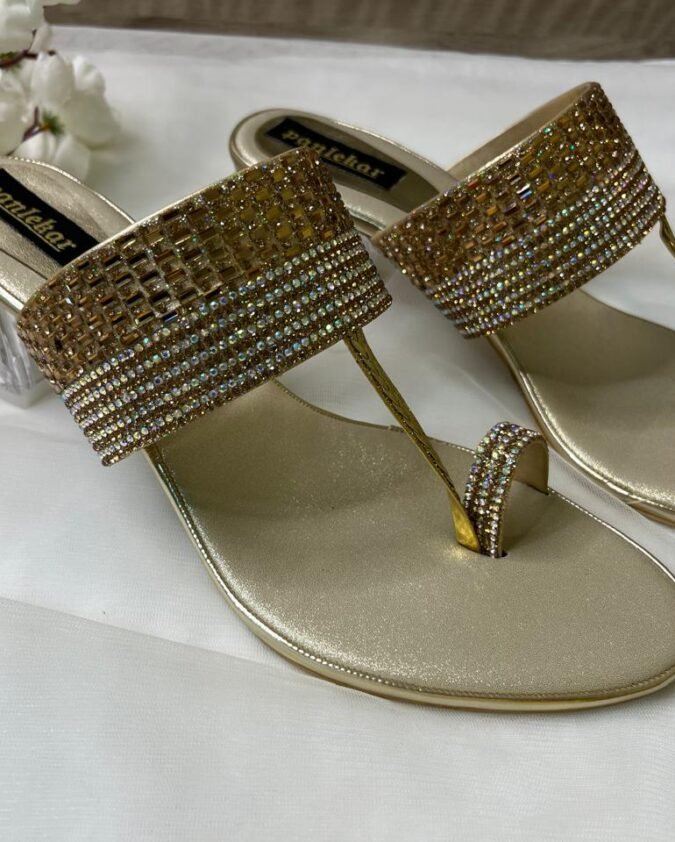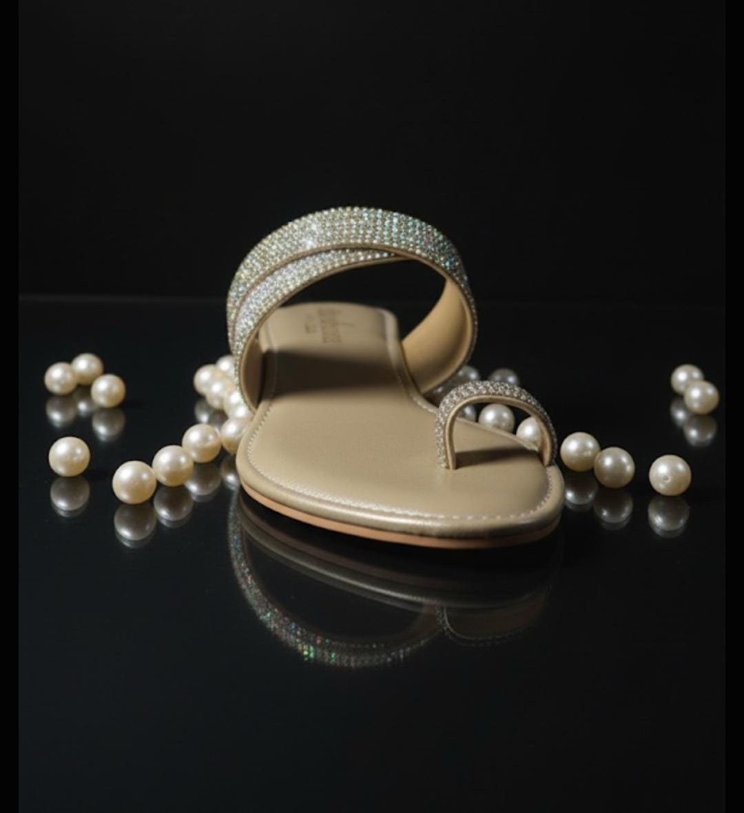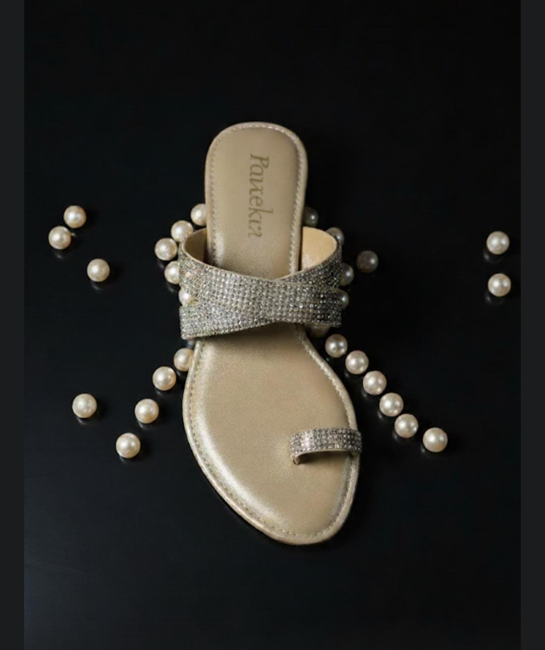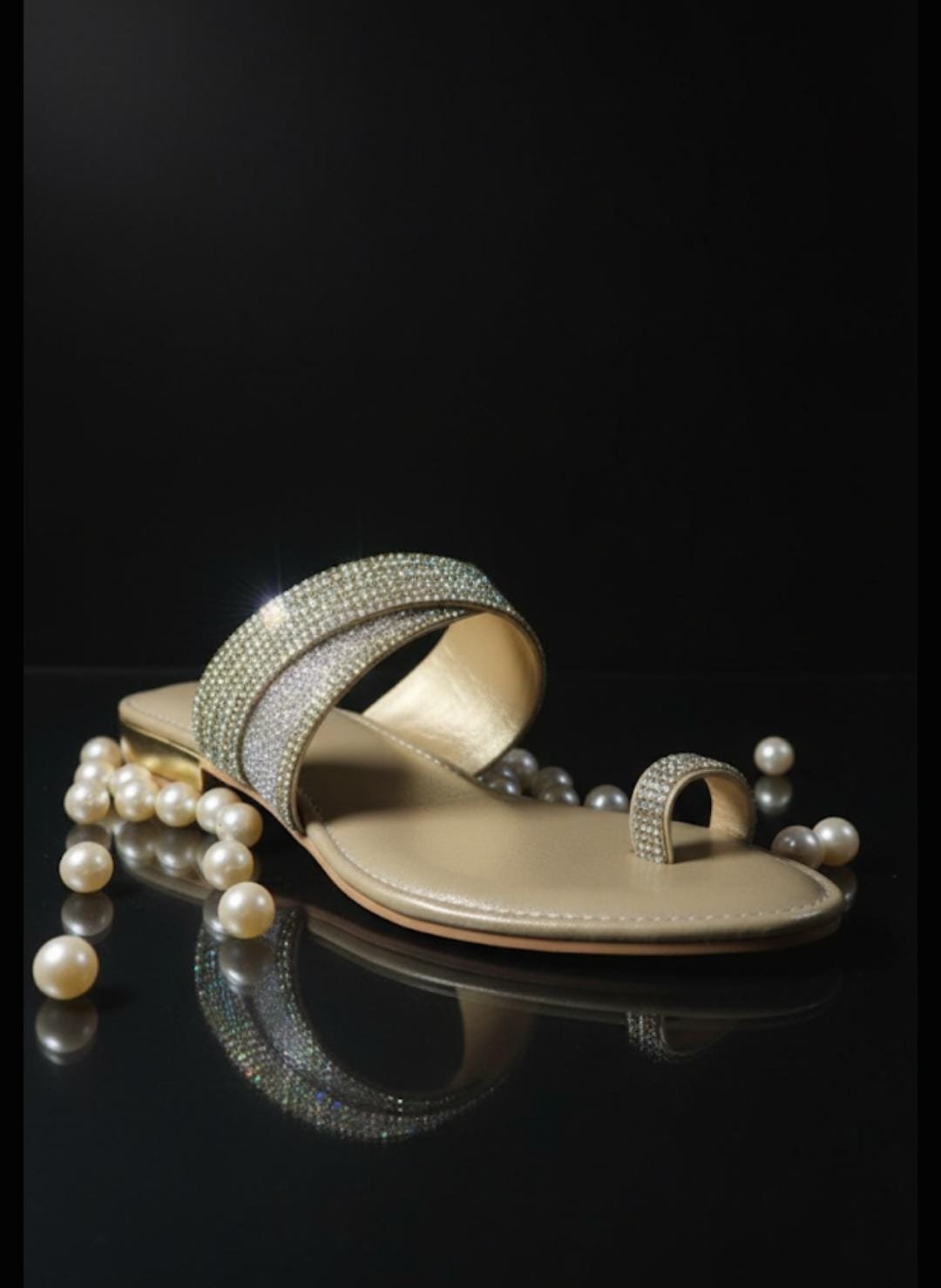 These sandals feature a sleek golden base with a soft cushioned sole for comfort. The highlight is the broad crystal-encrusted strap that adds a dazzling, high-fashion appeal. A matching embellished toe-ring strap ensures elegance while keeping the sandal secure. The design is modern yet timeless, making it perfect for ethnic wear as well as chic evening outfits.