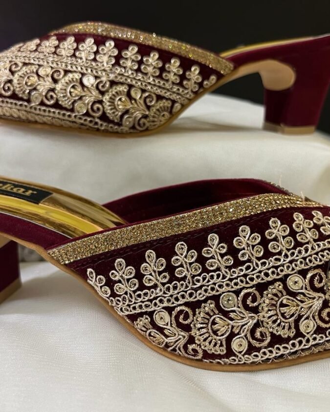 These sandals feature a sleek rose gold base with a soft cushioned sole for comfort. The highlight is the broad crystal-encrusted strap that adds a dazzling, high-fashion appeal. A matching embellished toe-ring strap ensures elegance while keeping the sandal secure. The design is modern yet timeless, making it perfect for ethnic wear as well as chic evening outfits.